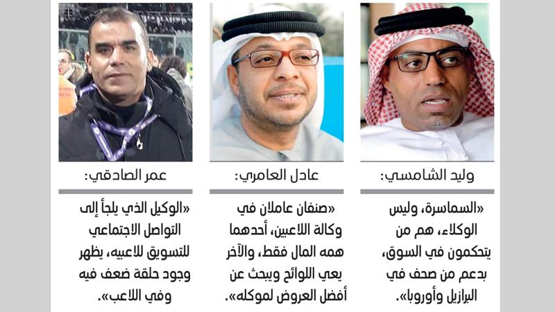 وطالب بالتفريق بين مُسمى وكيل لاعبين وسمسار لاعبين، وقال: «السماسرة، وليس الوكلاء، هم من يتحكمون في السوق، بدعم من صحف في البرازيل وأوروبا، وهم كذلك نشطون في التواصل الاجتماعي بهدف الترويج للاعبين، في بعض الحالات يرفعون سعر اللاعب إلى خمسة ملايين يورو، وفي الأساس قيمة النادي كله لا تتجاوز المبلغ الذي سينتقل به اللاعب إلى الإمارات». بدوره، برّأ عادل العامري، ساحتهم من انتشار الشائعات، مؤكداً أن «وظيفة وكيل اللاعبين الأساسية هي إيجاد عروض مناسبة لموكله، وسوق الانتقالات دائماً فرصة جيدة للاعبين والوكلاء على حد سواء»، معتبراً أن 50% من الأخبار التي يجرى تداولها قبل وخلال الانتقالات تكون صحيحة، وأن مثلها مجرد «شائعات».