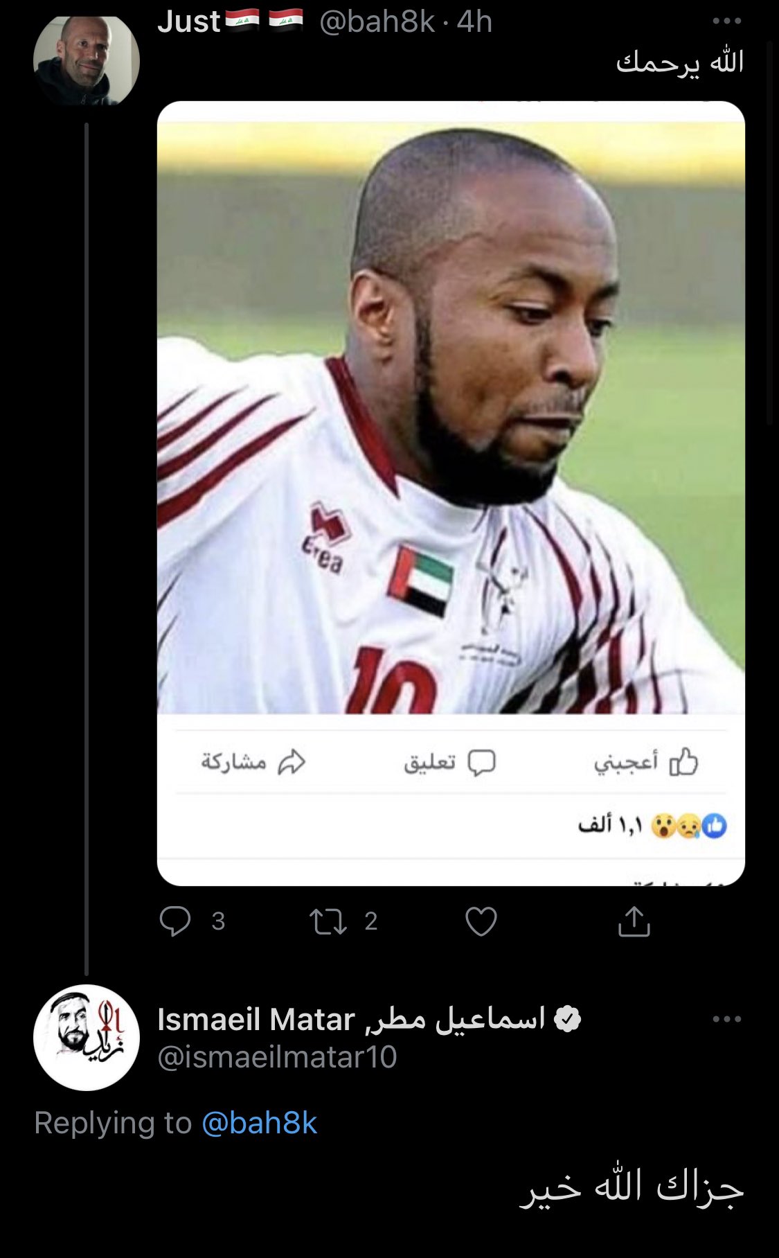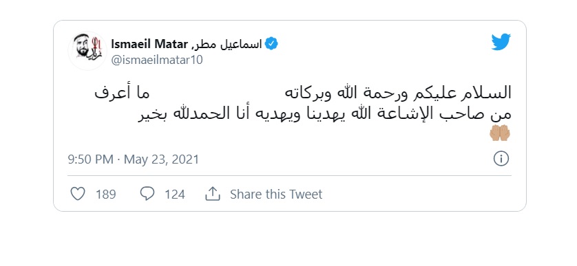 نشر نجم نادي الوحدة والمنتخب الوطني إسماعيل مطر تغريدة على حسابه الشخصي في موقع التواصل الاجتماعي "تويتر" يعلق خلالها على شائعة وفاته.