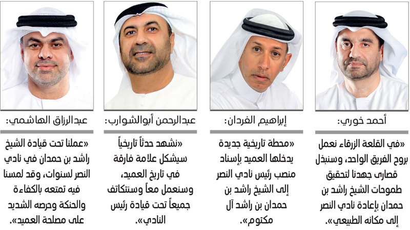 وأكد رئيس شركة النصر للاستثمار إبراهيم الفردان، أن «العميد يدخل محطة تاريخية جديدة بإسناد منصب رئيس نادي النصر إلى الشيخ راشد بن حمدان، الذي يحمل الإرث الراسخ في الدعم والرعاية اللامحدودين للعميد من والده المغفور له الشيخ حمدان بن راشد آل مكتوم، طيب الله ثراه».
