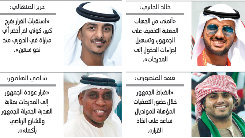 من جهته، أكد رئيس مجلس جماهير نادي بني ياس، حريز المنهالي، أن هذا القرار أسعدهم كثيراً كمشجعين، بعدما ابتعدوا كثيراً في الفترة الماضية عن مدرجات الدوري، بسبب الإجراءات الصحية الخاصة بـ«كوفيد-19»، وأضاف: «على المستوى الشخصي، استقبلت هذا القرار بفرح كبير، كوني لم أحضر مباراة في الدوري في المدرجات منذ نحو سنتين، باستثناء مباريات المنتخب الوطني الأخيرة في التصفيات المؤهلة لكأس العالم 2022». وأضاف: «هذا القرار يحتم على جميع المشجعين الذين سيوجدون في المدرجات المحافظة على الإجراءات الصحية بكل جدية وصرامة، في ظل الوضع الحالي المتعلق بفيروس كورونا». وأشار حريز المنهالي إلى أنه واجب عليهم أن يتقدموا بالشكر إلى اتحاد الكرة، وإلى الجهات المعنية التي سعت من أجل إصدار مثل هذا القرار، وعودة الجمهور الإماراتي مجدداً بعد طول غياب. بدوره وصف المشجع خالد الجابري قرار عودة الجمهور مجدداً إلى المدرجات بالخبر الجميل والمهم، معتبراً أن عودة الجمهور يمكن أن تعطي الدوري متعة وإثارة كبيرة، مشيراً إلى أنه يتمنى من الجهات المعنية التخفيف عن الجمهور، والتسهيل عليه، خصوصاً فيما يتعلق بإجراءات الدخول إلى المدرجات، لافتاً إلى أن الجمهور من الممكن أن يقبل إلى المدرجات في البداية بحماسة كبيرة، لكن هذه الحماسة يمكن أن تقل حال لم تكن إجراءات الدخول إلى المدرجات ميسرة.