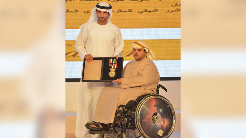 حمدان بن محمد يكرّم البطل عبدالله سلطان العرياني لفوزه بالجائزة. من المصدر