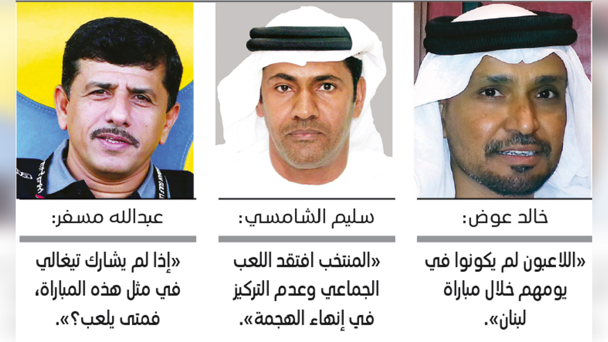 وأشار سليم الشامسي إلى أن المنتخب افتقد أمام لبنان اللعب الجماعي وعدم التركيز في إنهاء الهجمة، مؤكداً أن الأبيض فرط في فرصة ذهبية لحصد أول ثلاث نقاط. من جهته، أكد عضو لجنة المسابقات في اتحاد الكرة سابقاً خالد عوض، أنه رغم ما حدث في مباراة لبنان وأن الوضع الحالي للمنتخب لا يسر، الا أن الفرصة أمام المنتخب لاتزال قائمة في الدفاع عن حظوظه في التأهل للمونديال، مشدداً على أهمية التفاؤل، وأنه طالما أن هناك فرصة فإنه يجب أن نتمسك بها، لافتاً إلى أن اللاعبين لم يكونوا في يومهم خلال مباراة لبنان، مشيراً إلى أنه يتمنّى أن تتغير الأمور إلى الأفضل في مباراة سورية.