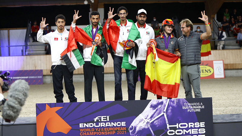 خطف فرسان الإمارات الأضواء في حفل تتويج أبطال مونديال القدرة للشباب والناشئين الذي احتضنته مدينة إرميلو في هولندا لمسافة 120 كلم، أول من أمس، بمشاركة نحو 75 فارساً وفارسة من 22 دولة، واتجهت الأنظار إلى فرسان الإمارات على منصة التتويج بعد تكرار المشهد السابق نفسه الذي شهده العالم قبل نحو أربعة أشهر بتتويجهم بالميداليتين الذهبية والفضية في بطولة العالم للكبار بمدينة بيزا الإيطالية.