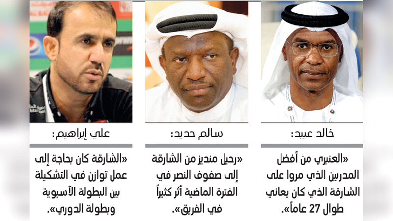 وأشار خالد عبيد إلى أنه لايرى أن مشكلة الفريق الشرقاوي في المدرب عبدالعزيز العنبري، واصفا إياه بإنه من افضل المدربين الذي مروا على الشارقة الذي كان يعاني طوال 27 عاما في حين أن العنبري حقق مع الفريق بطولة الدوري، معتبرا أن الحديث عن استبداله أمر غير موفق لاسيما ان الشارقة لايزال في المنافسة، معتبرا أن البطولة الآسيوية ليست مقياسا لان هناك مدربين كبار أخفقوا فيها.