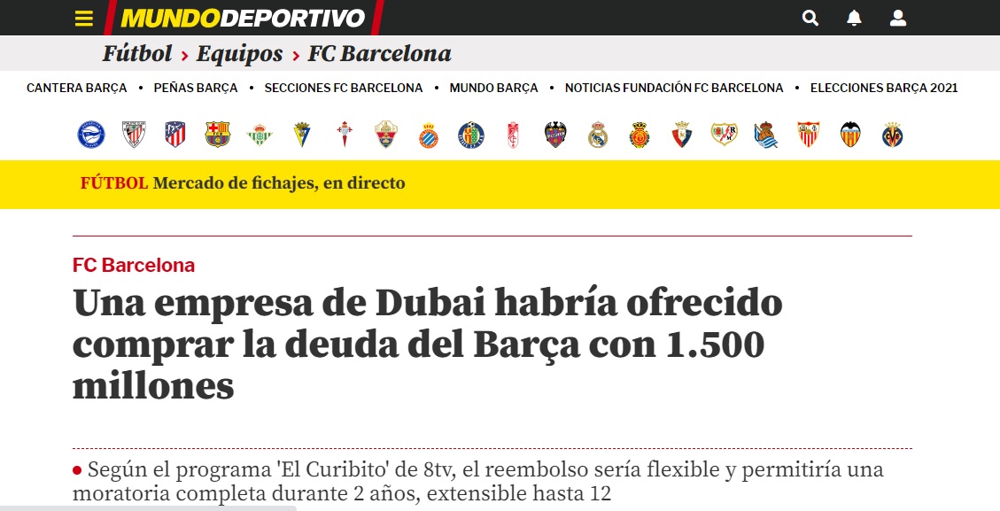 ذكرت وسائل إعلام إسبانية أن نادي برشلونة قد يجد ضالته للتخلص من الأزمة المالية التي يمر بها النادي عن طريق شركة تقدمت له بعرض جنوني لتسديد ديون "البلوغرانا". وأوضحت صحيفة موندو ديبورتيفو أن إحدى الشركات في دبي، دون ذكر تفاصيل عنها، عرضت على برشلونة شراء ديونه البالغة 1.5 مليار يورو، إلى جانب السماح بوقف تسديد القرض لسنتين مع إمكانية التمديد إلى 12 سنة.