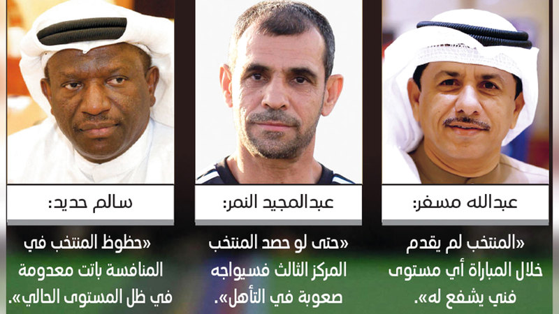 بدوره أكد الدولي السابق والمستشار القانوني سالم حديد أن «المنتخب ظهر أمام كوريا الجنوبية دون لون أو طعم»، مشيراً إلى أنه عانى بسبب غياب صانع ألعاب حقيقي، مؤكداً أن «طحنون الزعابي والحارس علي خصيف كانا الأبرز في المنتخب في مباراة كوريا.