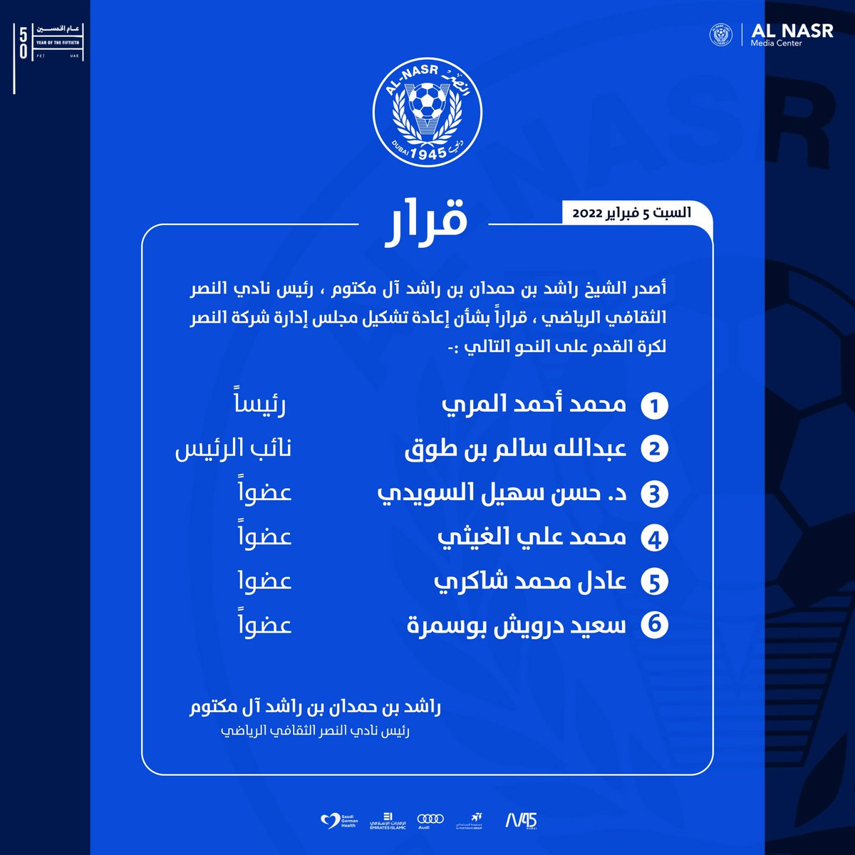 أصدر الشيخ راشد بن حمدان بن راشد آل مكتوم، رئيس نادي النصر الثقافي الرياضي قراراً بإعادة تشكيل مجلس إدارة شركة النصر لكرة القدم، برئاسة محمد أحمد المري، وعبدالله سالم بن طوق نائباً للرئيس، وعضوية كلاً من الدكتور حسن سهيل، محمد علي الغيثي، عادل محمد شاكري، وسعيد درويش بوسمرة.