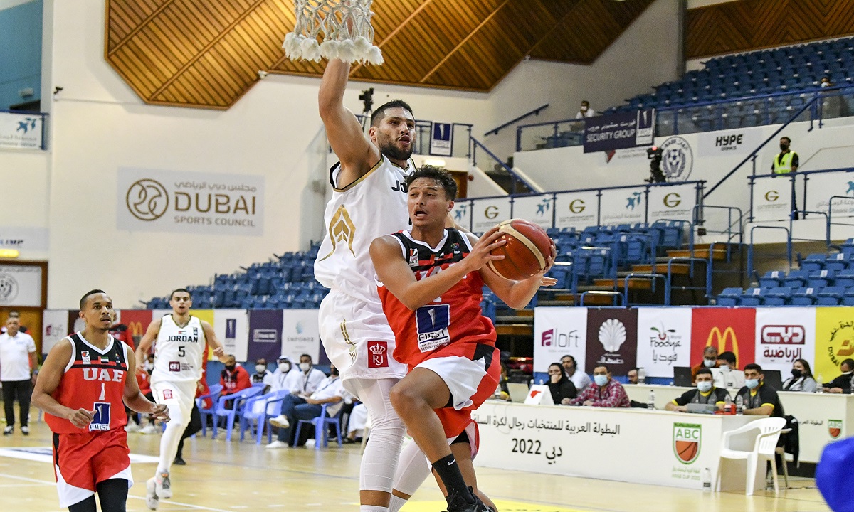نجم المنتخب الوطني الشاب محمود أسد خلال اختراقه دفاعات سلة الأردن في افتتاح البطولة العربية بدبي تص