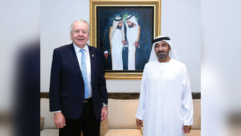 أحمد بن سعيد خلال استقبال رئيس مجلس إدارة «وورلد ريجبي» بيل بومونت. من المصدر