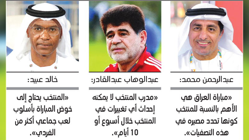 وقالوا لـ«الإمارات اليوم» إن مباراة العراق تحتاج إلى تعامل خاص، من قبل اللاعبين أو الجهازين الفني والإداري، وستحدد مصير المنتخب في التأهل للمونديال من عدمه، لذلك يجب أن تحظى بأهمية كبيرة جداً من الجميع.