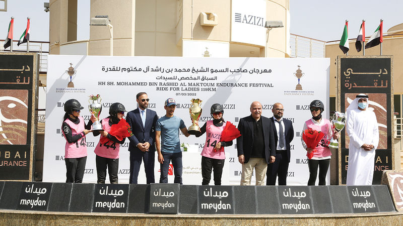 شهد صاحب السموّ الشيخ محمد بن راشد آل مكتوم، نائب رئيس الدولة رئيس مجلس الوزراء حاكم دبي، أمس، سباق السيدات لمسافة 119 كيلومتراً في افتتاح مهرجان محمد بن راشد للقدرة في مدينة دبي الدولية للقدرة، بمشاركة 89 فارسة من مختلف الإسطبلات وأندية الفروسية في الدولة.