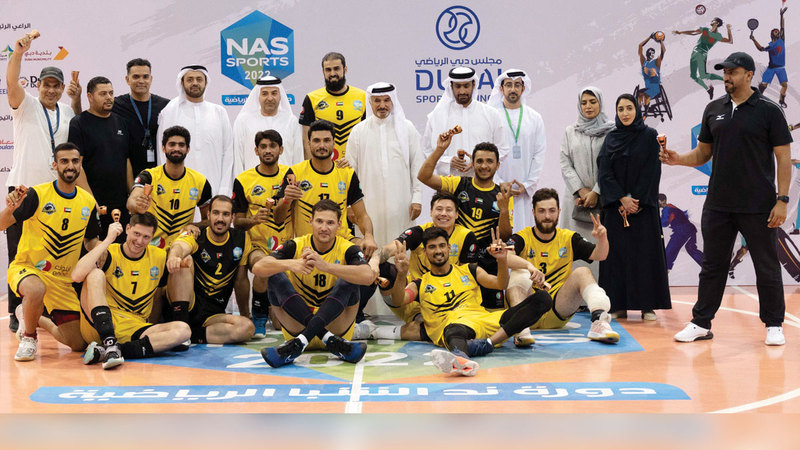 فريق فهود زعبيل يحتفل ببرونزية الكرة الطائرة بحضور سعيد حارب. من المصدر