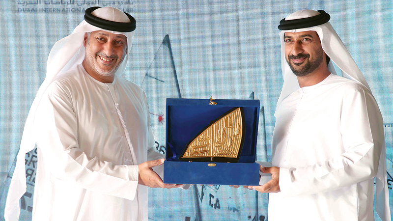 حارب يقدم درع نادي دبي الدولي للرياضات البحرية للكمدة. من المصدر