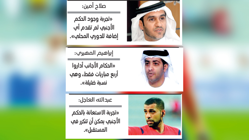 وأضاف «مع احترامي لجميع الآراء في هذا الخصوص، فإنه لا يمكن تقييم تجربة الحكم الأجنبي من خلال أربع مباريات فقط، لذلك فإنني لا أستطيع الحكم بأن التجربة كانت ناجحة أم فاشلة، لكنها بحاجة إلى مزيد من الوقت قبل الحكم عليها ومعرفة مدى الاستفادة منها، وهل الفائدة منها هو خروج المباريات التي تم الاستعانة فيها بحكام أجانب إلى بر الأمان، مع العلم أن هناك مباريات كثيرة خرجت إلى بر الأمان بأطقم تحكيم إماراتي، والدليل على ذلك أن نهائي كأس رابطة المحترفين الذي أقيم أخيراً بين العين وشباب الأهلي قاده طاقم تحكيم جديد وصغير في السن وخرج بالمباراة إلى بر الأمان».