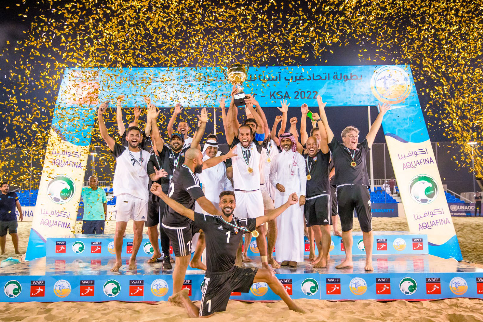توج منتخب الإمارات بطلا لبطولة اتحاد غرب آسيا للكرة الشاطئية بعد فوزه على نظيره العماني 3-2 في المباراة النهائية التي جمعت بينهما في مدينة جازان بالمملكة العربية السعودية والتي تستضيف منافسات البطولة.