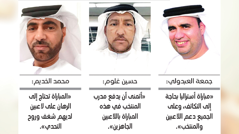 من جانبه، رأى مدرب دبا الفجيرة ومسافي السابق محمد عبيد الخديم، أن مباراة أستراليا تحتاج إلى الرهان على لاعبين لديهم شغف ولديهم روح التحدي والقتال في الملعب طوال الـ90 دقيقة. وبخصوص الأوراق الرابحة التي يمكن أن يراهن عليها المنتخب في هذه المباراة، قال «العناصر الموجودة حالياً في المنتخب والتي تم اختيارها من قبل المدرب هي جميعها أوراق رابحة».