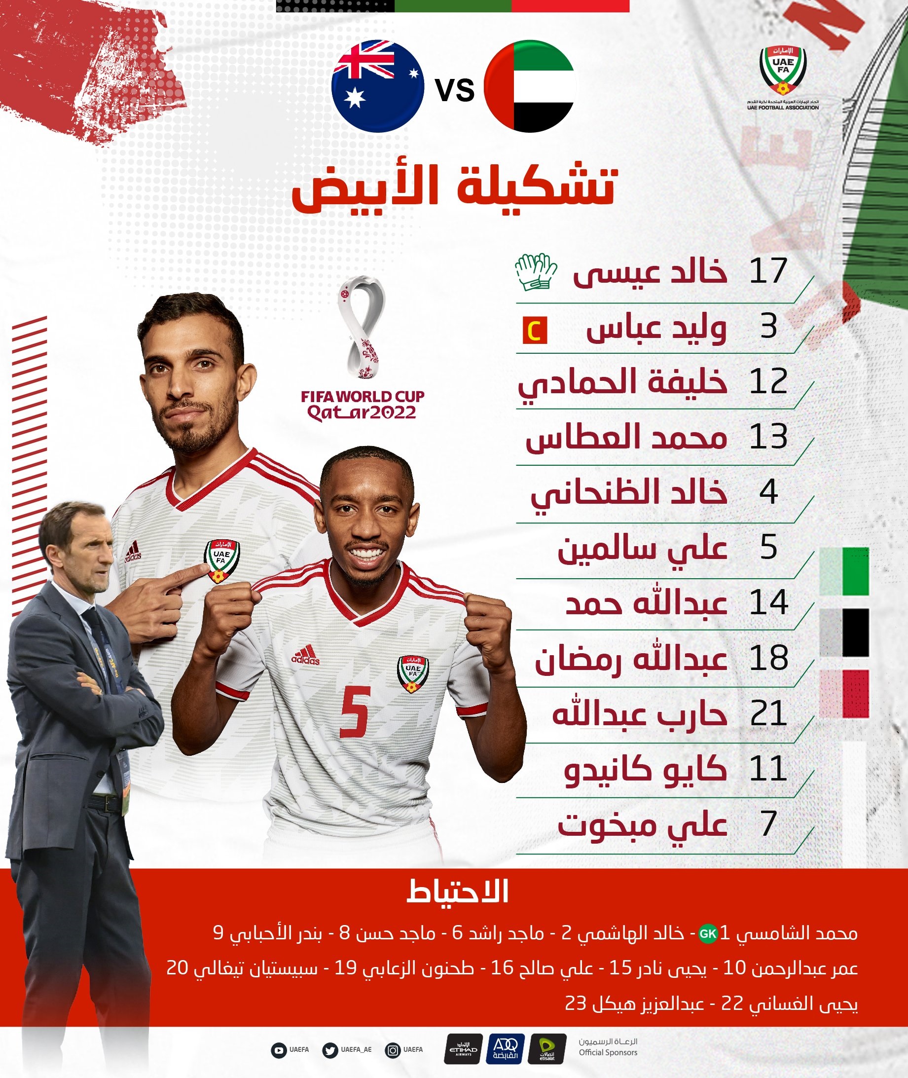 يلعب منتخبنا الوطني بكرة القدم الساعة 10 من مساء اليوم بتوقيت الامارات أمام نظيره منتخب استراليا على استاد أحمد بن علي في الدوحة ضمن الملحق الآسيوي المؤهل لكأس العالم 2022، ويلتقي الفائز من المباراة مع منتخب بيرو يوم 13 الجاري في الدوحة أيضا لحسم بطاقة التأها المباشر إلى مونديال قطر.