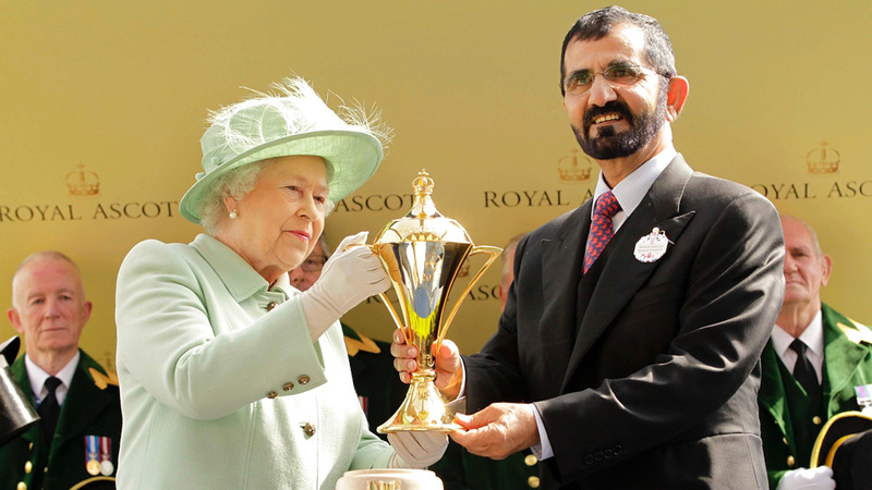 صاحب السمو الشيخ محمد بن راشد آل مكتوم، نائب رئيس الدولة رئيس مجلس الوزراء حاكم دبي، يتسلّم الكأس الذهبية من الملكة الراحلة إليزابيث الثانية، خلال مشاركة سابقة للإمارات في مهرجان «رويال آسكوت» البريطاني العريق لسباقات الخيول، حيث يحظى سموه باستقبال دافئ وعلاقة مميزة لدى ملكة بريطانيا الراحلة، خلال حضور ومشاركة سموه في السباق عبر التاريخ.