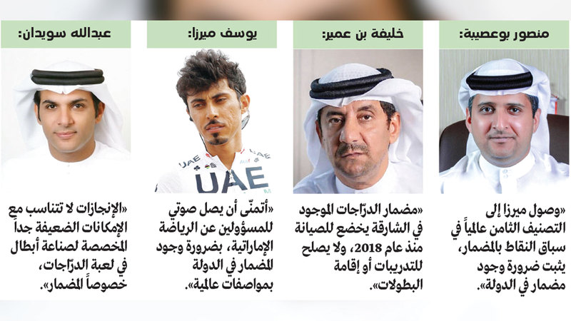 أما قائد المنتخب الوطني يوسف ميرزا، المصنف الثامن عالمياً في سباق النقاط بالمضمار، فقال إن إنجازات الإمارات معظمها في المضمار، وبالتالي وجود مضمار سيزيد من حجم الإنجازات واكتشاف المواهب، مشيراً إلى أنه يتحدث عن ضرورة إنشاء مضمار للأجيال القادمة كونه من أهم الركائز الأساسية للعبة. وقال ميرزا: «أناشد وأتمنّى أن يصل صوتي للمسؤولين عن الرياضة الإماراتية، بضرورة وجود المضمار في الدولة بمواصفات عالمية، وفرصة لاكتشاف اللاعبين وزيادة إنجازات الإمارات ووضعها على خارطة اللعبة عالمياً».