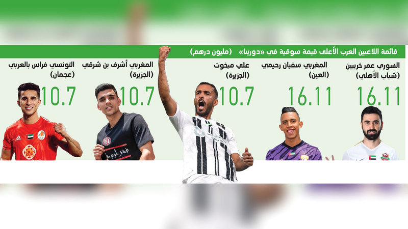 يحتل نجم الجزيرة علي مبخوت المركز 13 في قائمة أعلى اللاعبين قيمة سوقية في الدوريات العربية بكرة القدم، التي تضم أيضاً أربعة لاعبين من دوري أدنوك للمحترفين في موسم 2022-2023، فرضوا حضورهم القوي بين 20 نجماً لهم وزنهم المالي والفني، بحسب إحصاءات موقع «ترانسفير ماركت».