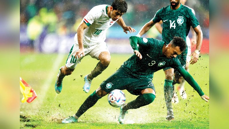 وأجاد أسود الرافدين التعامل مع الكرات العالية والطولية التي فرضتها أجواء اللقاء الممطرة، فتفوق على صعيد الالتحامات لتميز لاعبيه على مستوى القوة البدنية فاستطاع أن يهدد مرمى الحارس نواف العقيدي، لكن دون هز الشباك.