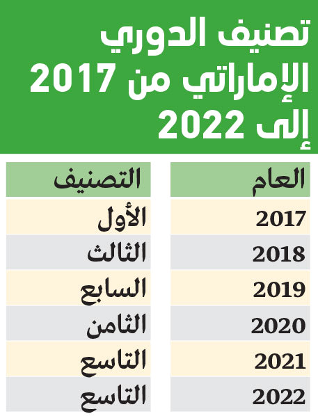واحتل الدوري الإماراتي في التصنيف القاري في 2022 المركز التاسع برصيد 49.169 نقطة، في حين أنه حصد 96.56 نقطة في 2017، محققاً المرتبة الأولى.