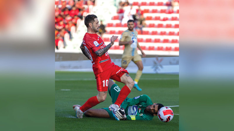 نجم شباب الأهلي كارتابيا يحاول مراوغة حارس الظفرة عبدالله سلطان. من المصدر
