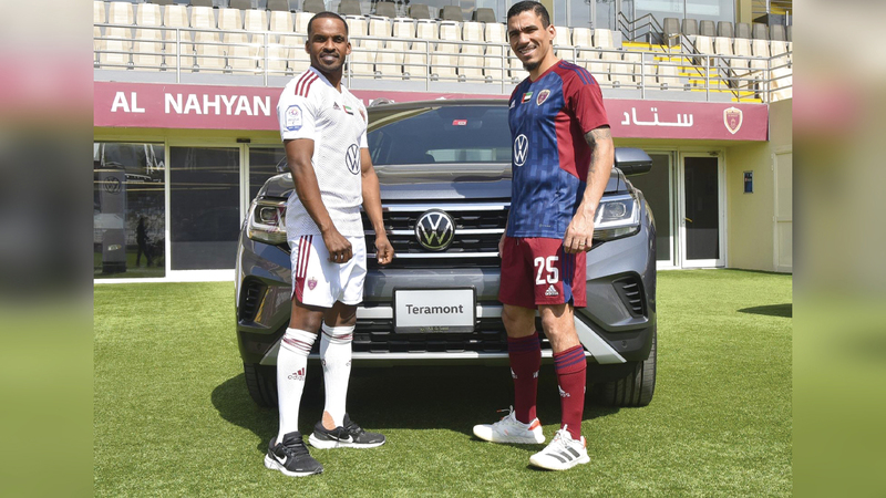 نجما الوحدة آلان ومحمود خميس خلال الإعلان عن اتفاقية الرعاية مع «فولكس واجن». من المصدر