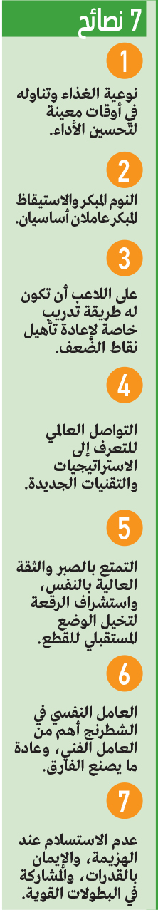 وتابع: «في جميع الرياضات يعتبر النوم المبكر والاستيقاظ المبكر عاملين أساسيين في تطوير مهارات اللاعبين، كون أن الذهن يكون صافياً في الفترة الصباحية، خصوصاً بعد صلاة الفجر، وعلى اللاعب أن تكون له طريقة تدريب خاصة به لإعادة تأهيل نقاط الضعف عنده، وأن يكون هناك تدريب متواصل لهندسة استراتيجياته في اللعبة، والتواصل العالمي من خلال التعرف إلى الاستراتيجيات العالمية والتقنيات الجديدة».