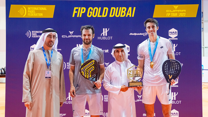 سعيد بن مكتوم سلم كأس فئة الاتحاد الدولي للبادل للثنائي بنيامين تيسون وفيكتور مينا. من المصدر