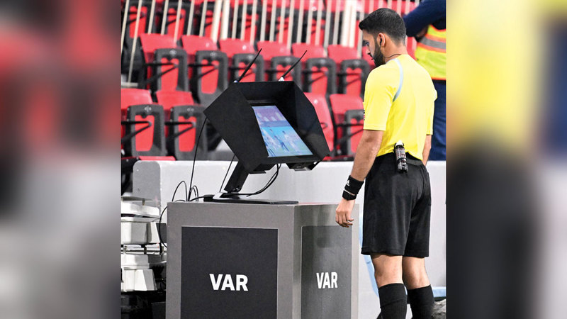 حكم مباراة النصر والجزيرة يوسف الجسمي يراجع تقنية «الفار ». تصوير: نجيب محمد