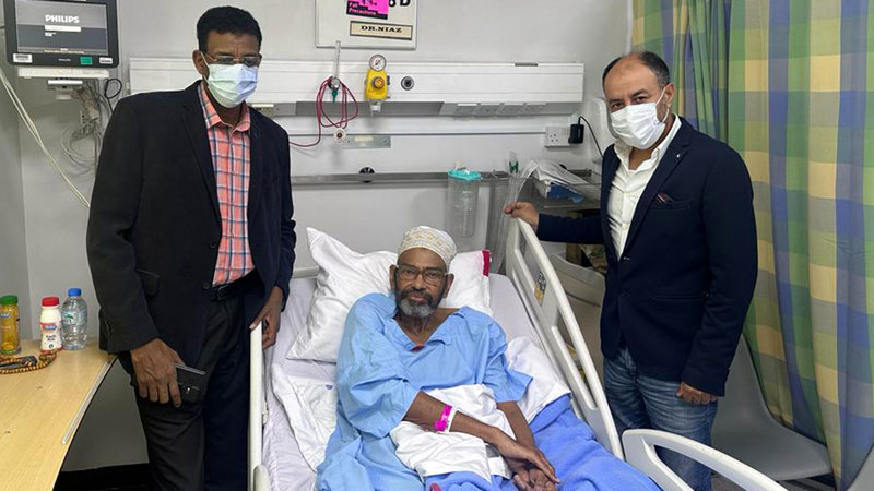 الزميلان أحمد أبوالشايب ومنصور السندي خلال زيارتهما للزميل بهاء الدين عطا في المستشفى. الإمارات اليوم