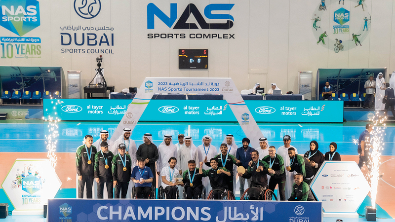 فريق شرطة دبي متوجاً بلقب بطولة كرة السلة على الكراسي المتحركة بتغلبه على «إسعاف دبي» 54–36. من المصدر