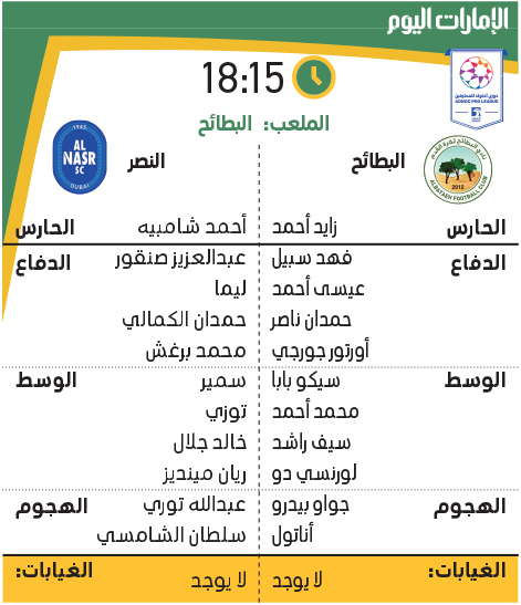يخوض فريق البطائح واحدة من أصعب مواجهاته في دوري أدنوك للمحترفين، وأكثرها تحديداً لمسيرته في المسابقة، حينما يستقبل النصر عند الساعة 18:15 من مساء اليوم، على استاد محمد بن خالد، في افتتاح الجولة الـ25 من البطولة.