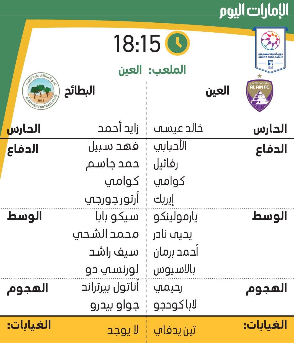 »، بغض النظر عن نتيجة منافسه دبا الذي يلتقي الظفرة. ويملك العين 51 نقطة في المركز الثاني، بينما لدى البطائح 21 نقطة في المركز الـ12.
