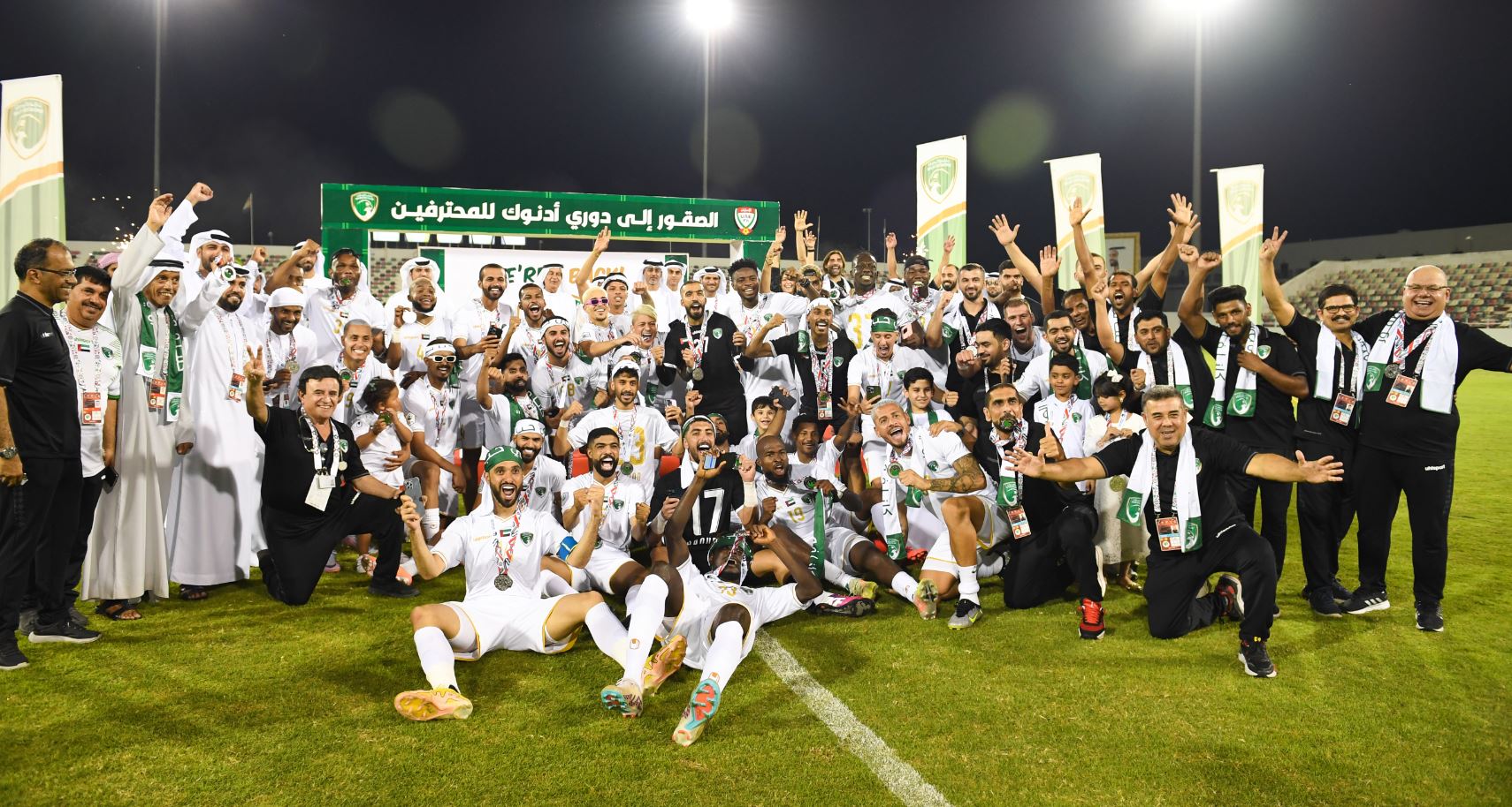 اختتم فريق الإمارات اليوم مشاركته في موسم الدرجة الأولى باحتفالية "الصعود" إلى دوري أدنوك للمحترفين، وذلك بفوز كبير على فرسان هسبانيا بنتيجة 3-1 في اليوم الأول من الجولة الختامية، على أن تقام باقي مباريات الجولة غدا. وكان الإمارات حجز بطاقة الصعود في الأسبوع الماضي، لكنه بعد لقاء فرسان هسبانيا احتفل بالصعود، وتم تتويجه بالميداليات الفضية للمركز الثاني.