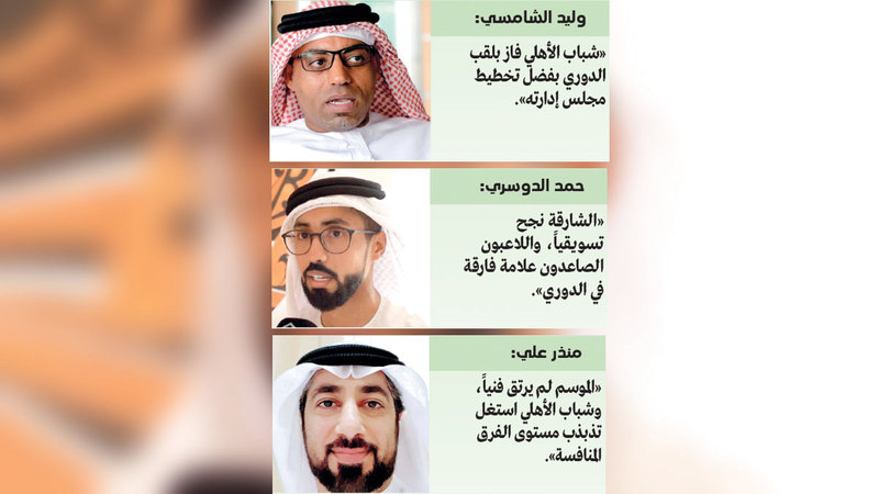 وأشاروا إلى أن الموسم المنصرم نجح تسويقياً وإدارياً في عدد من الأمور، نتيجة صفقات الشارقة العالمية التي أبرمها، وأسهمت في جذب الجمهور، إضافة إلى العمل الإداري الناجح في التخطيط والتدبير، خارج الملعب، ومن ذلك شباب الأهلي بطل الدوري، الذي توج بالدرع، رغم أنه لا يملك هداف البطولة أو أفضل خط دفاع أو صانع ألعاب، وإنما عن طريق نجاح مجلس الإدارة في استقطاب مدرب جيد ونوعيات معينة من اللاعبين بأسعار مقبولة.
