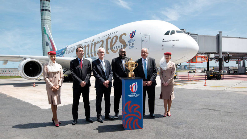 وفور هبوط طائرة الإمارات في مطار باريس شارل ديغول، قام أسطورة الرجبي الجنوب إفريقي تينداي متواريرا، الذي كان أحد نجوم الفريق الفائز بكأس العالم للرجبي 2019، بتسليم الكأس إلى جاك ريفوال، رئيس اللجنة الفرنسية المنظمة، بحضور السير بيل بومونت، رئيس مجلس الرجبي العالمي وسيدريك رينارد، مدير «طيران الإمارات» في فرنسا. وتعود شراكة «طيران الإمارات» مع بطولة العالم للرجبي إلى عام 2007، عندما رعت لأول مرة كأس العالم للرجبي 2007 في فرنسا. ثم أصبحت شريكاً عالمياً لكأس العالم 2011 في نيوزيلندا، وأول شريك عالمي يوقع اتفاقية لكل من إنجلترا 2015، واليابان 2019، وحالياً شريك عالمي لكأس العالم للرجبي فرنسا 2023، وكأس العالم للرجبي أستراليا 2027.