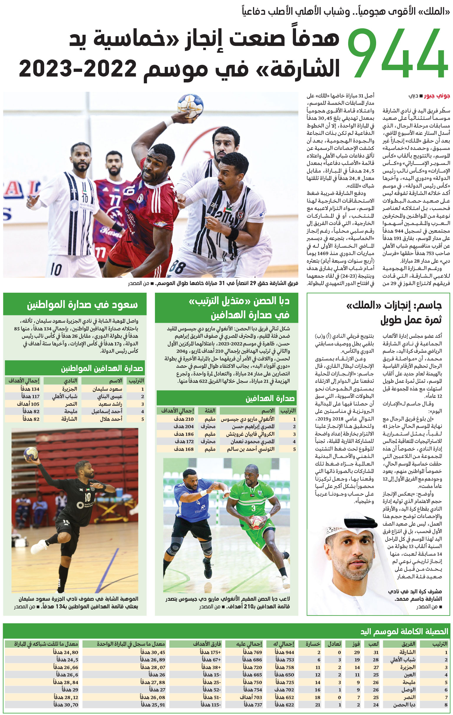 944 هدفاً صنعت إنجاز «خماسية يد الشارقة» في موسم 2022-2023