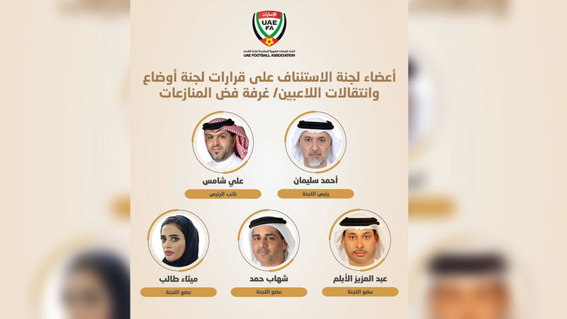 وضمت لجنة الاستئناف على قرارات لجنة أوضاع وانتقالات اللاعبين كلاً من أحمد سليمان رئيساً للجنة، وعلي شامس نائباً لرئيس اللجنة، وثلاثة أعضاء، هم: عبدالعزيز الأبلم، وشهاب حمد، وميثاء طالب.