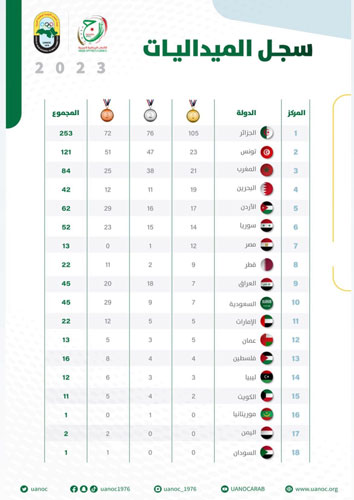 وكانت الجزائر الدولة المضيفة للحدث حصدت 253 ميدالية، منها 105 ذهبيات و76 فضية و72 برونزية، فيما احتلت تونس المركز الثاني برصيد 121 ميدالية (23 ذهبية و47 فضية و51 برونزية)، وجاءت الرياضة الإماراتية في المركز الـ11 برصيد 22 ميدالية، إضافة إلى خمس ميداليات تقلدها منتخب أصحاب الهمم لا تحتسب في الترتيب النهائي لجدول الميداليات.