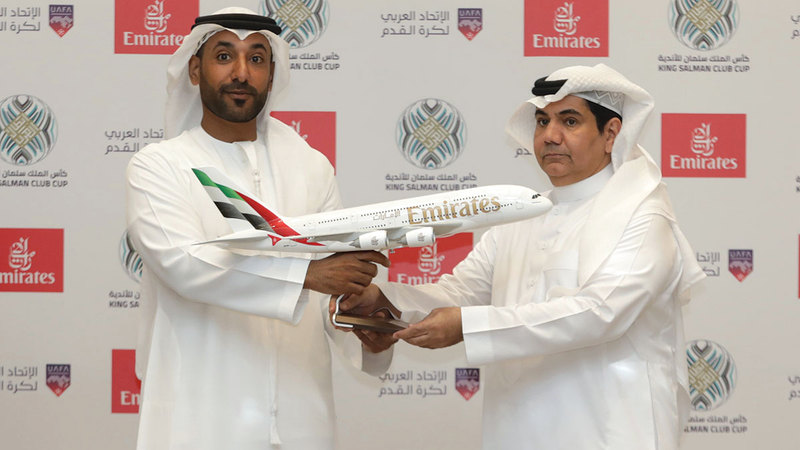 العزيبي والدلاك خلال مؤتمر توقيع الاتفاقية بين طيران الإمارات و«كأس الملك سلمان للأندية 2023». من المصدر