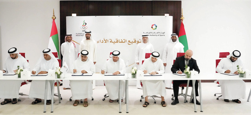 راشد بن حميد والفلاسي يشهدان توقيع «اتفاقية الأداء» بين اللجنة الأولمبية الوطنية والهيئة العامة للرياضة. من المصدر