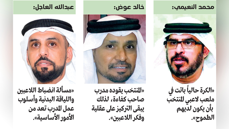 ويرى عضو لجنة المسابقات في اتحاد الكرة سابقاً، خالد عوض، أن الجانب الإداري بالنسبة للاعبين في المنتخب أهم من الجانب الفني من وجهة نظره، مشدداً على أهمية وجود تغيير في فكر وعقلية اللاعبين، مشيراً إلى أن «المشكلة ليست فنية بحتة، وإنما جزء بسيط منها». واعتبر أن الجزء الأكبر من هذه المشكلة يتمثل في عقلية اللاعبين من الجانب الإداري، لافتاً إلى أن هذا الأمر يبدأ من الآن، مؤكداً أهمية تحلي اللاعب بالحماس والعطاء، إلى جانب تحمل المسؤولية منذ بداية مشواره في المراحل السنية وصولاً للفريق الأول. وتابع خالد عوض: «لاحظنا خلال مباريات البطولة العربية للأندية كيف أن هناك أندية شاركت في البطولة وليس لديها دوري قوي، مثل الدوري الإماراتي والسعودي، لكنها تفوقت ليس فنياً فقط وإنما بالروح والعطاء وهذا ما نفتقده، لذلك فإنه حتى لو تم جلب أفضل مدرب يبقى أن الروح والعطاء وعقلية اللاعب وفكر تحمل المسؤولية مهم للغاية، لذلك لابد من الاهتمام بهذا الجانب من قبل الأندية». وأضاف عوض: «المنتخب الآن يقوده مدرب صاحب كفاءة في مجال التدريب، لذلك يبقى التركيز على عقلية وفكر اللاعبين».