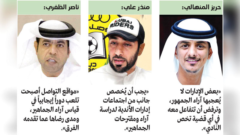 وقالوا لـ«الإمارات اليوم» إن مواقع التواصل الاجتماعي أصبح لها تثير إيجابي على كرة القدم بشكل خاص والوسط الرياضي بشكل عام، ولابد من التركيز على الوجه الحسن لها، دون اعتبارها عاملاً سلبياً يعوق تقدم وتطور الأندية. وأضافوا أن التحدي الأكبر لإدارات الأندية هو أن تثبت للجمهور أن القرارات التي اتخذت في الغرف المُغلقة كانت هي الصحيحة، بدلاً من تجاهل آرائهم أو السخط على كل انتقاد يقدمونه.