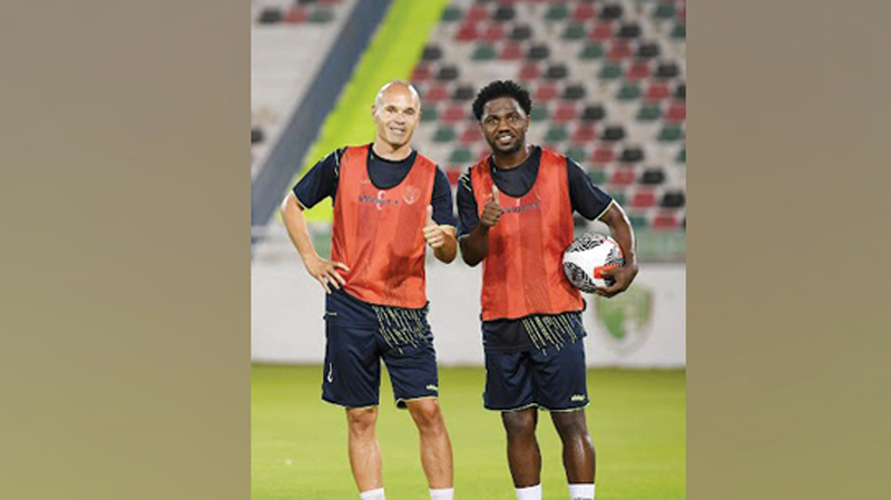 الحمادي مع إنييستا خلال التدريبات. من المصدر