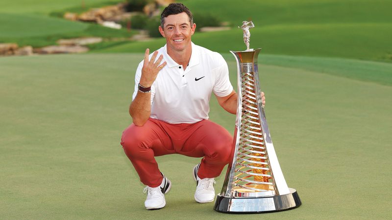 روري ماكلروي حامل لقب جولة «دي بي ورلد» الموسم الماضي مع الكأس في دبي. من المصدر