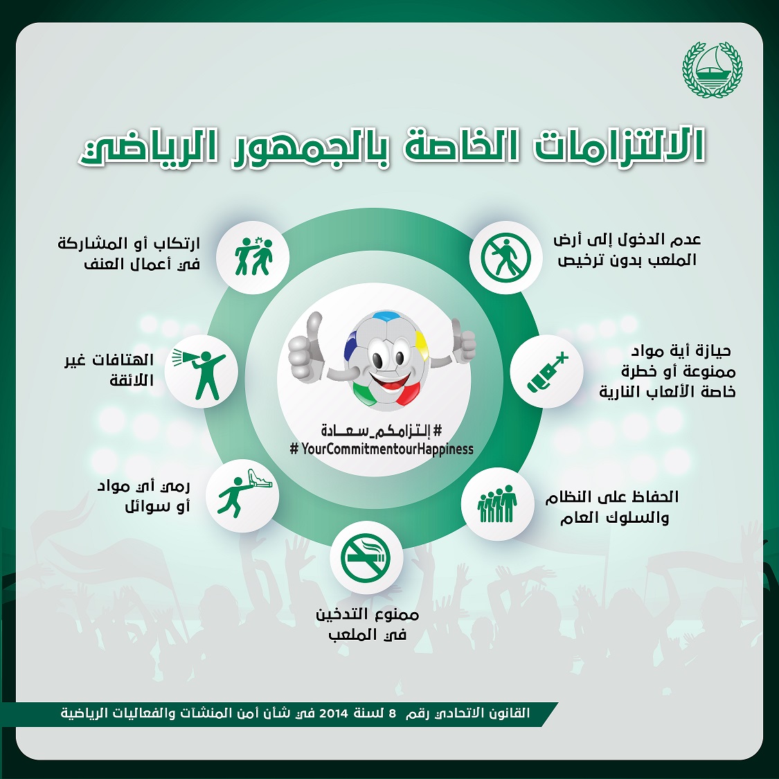 وأشار إلى أن القانون يعاقب بالحبس وبالغرامة التي لا تقل عن عشرة آلاف درهم ولا تتجاوز ثلاثين ألف درهم أو بإحدى هاتين العقوبتين كل من ارتكب أو شارك أو حرض أو شرع في أعمال العنف وكل من رمى أي مواد أو سوائل من أي نوع باتجاه المتفرج الآخر أو في اتجاه المنطقة المحيطة بالملعب أو الملعب نفسه وكذلك كل من تلفظ بألفاظ بذيئة أو كتابتها أو أي إيماءات من شأنها الإساءة أو قام بدعوات ذات طبيعة عنصرية أثناء إقامة الفعاليات الرياضية وأيضاً بحق كل من يستغل الملعب لأغراض سياسية.