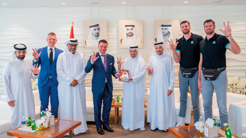 سعيد حارب يتوسط وفد نادي وولفز الليتواني بحضور ناصر أمان آل رحمة وعلي عمر. من المصدر