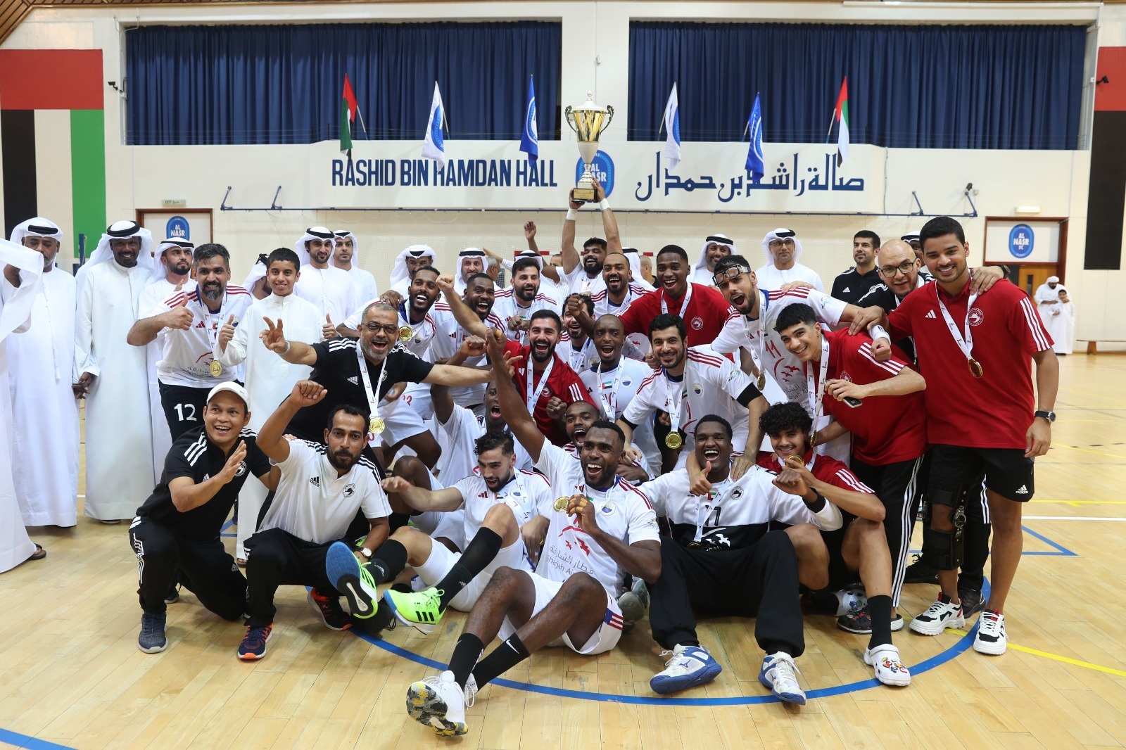 وعقب انتهاء المباراة، توج رئيس اتحاد كرة اليد نبيل عاشور، ورئيس مجلس الشارقة الرياضي عيسى هلال الحزامي، ورئيس مجلس إدارة نادي الشارقة الرياضي علي سالم المدفع، وعضو مجلس إدارة نادي الشارقة الرياضي رئيس الألعاب الجماعية في النادي محمد عبيد الحصان، وأعضاء اتحاد كرة اليد ومجلس إدارتي الناديين، شباب الأهلي بالميداليات الفضية، والشارقة الذهبية وكأس النسخة السابعة.